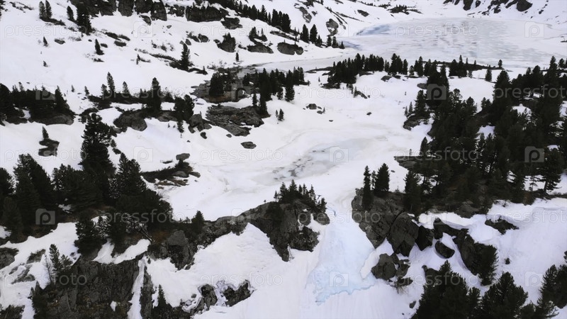Снежная горная долина, показывающая частично замороженное озеро и сосны