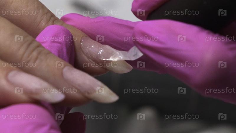 Близкий взгляд на ногти с помощью гелевого расширения, технический специалист по красоте тщательно смешивает слои геля на ногтях клиента