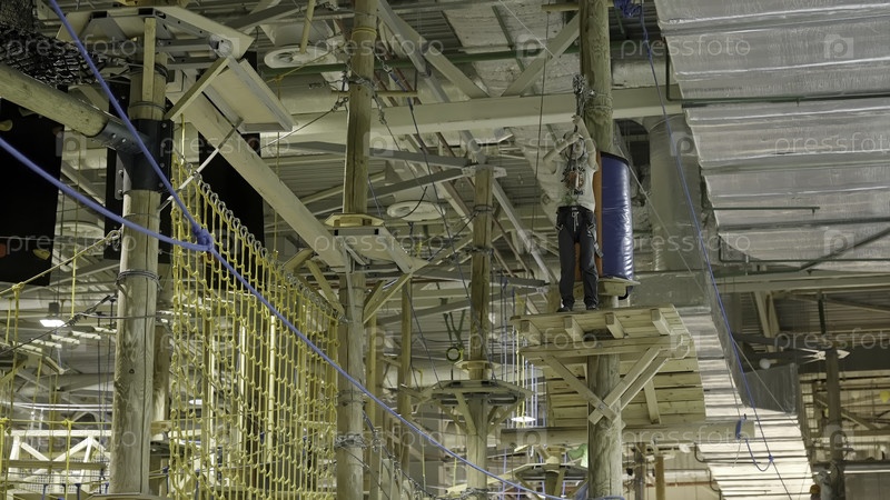 Маленький мальчик готовится к приключениям на циплайне в крытом парке веревок