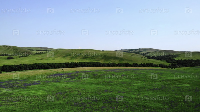 Вид с воздуха зеленых летних холмов и голубого неба