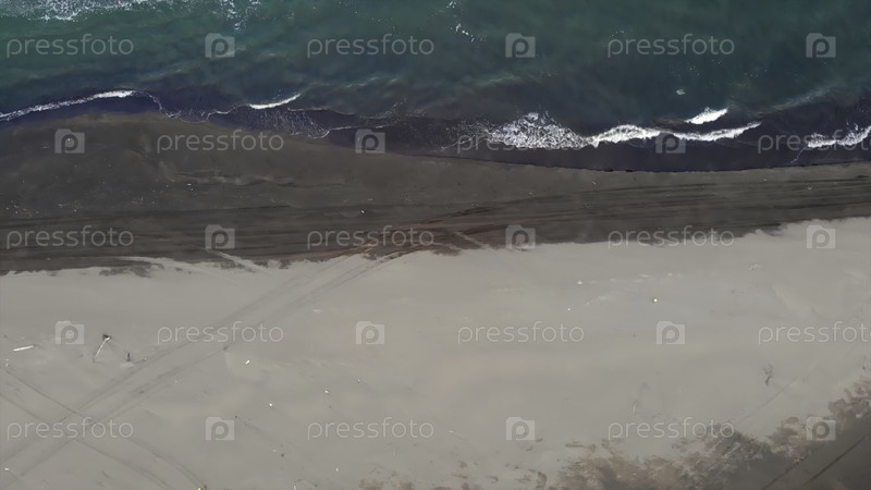 Воздушный дрон, летящий над песчаным пляжем и океанскими волнами