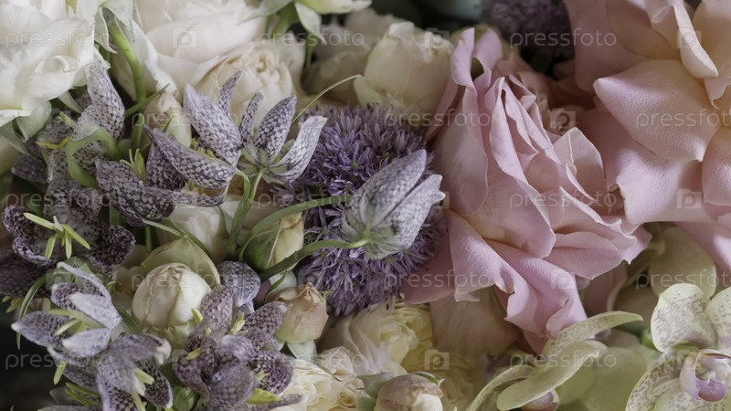 Потрясающая цветовая аранжировка с розами и орхидеями в тонких пастельных оттенках