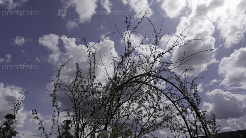 Цветящая дуга сливового дерева с движущимися облаками