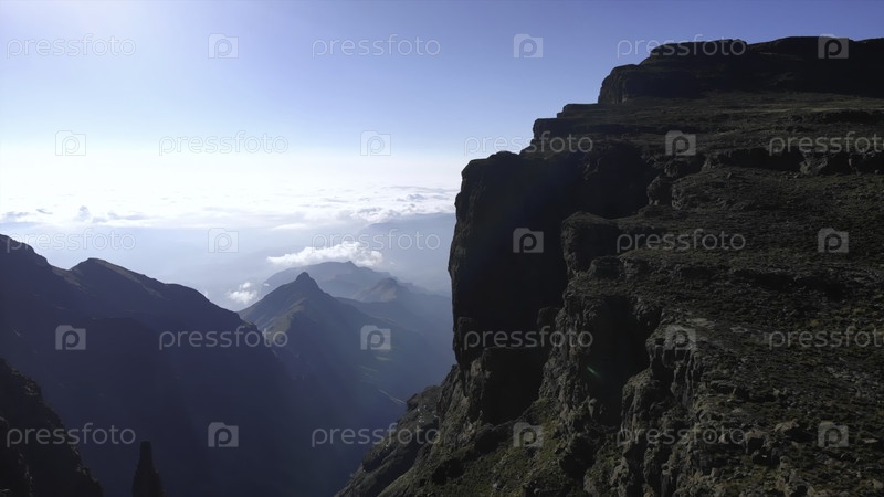 Долина с низкими облаками, вид из воздуха на туманную долину с рассветным освещением на крутых горных краях