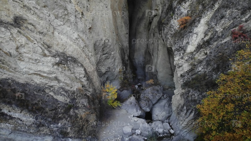 Дрон, летящий в глубокий узкий каньон с осенними деревьями