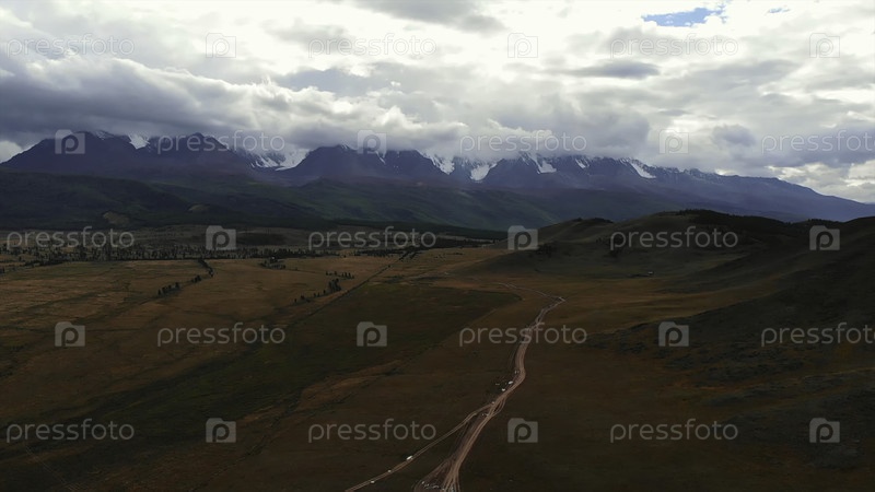 Автомобили едут по грунтовой дороге в сторону заснеженных гор.СМИ