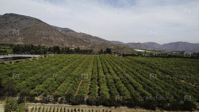 Вид с воздуха, летящий над зеленым сельскохозяйственным садом