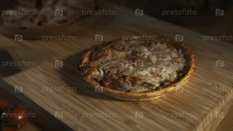 Повар режет маленькую итальянскую пиццу на деревянной доске