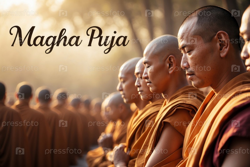 День Магха-Пуджи Традиционная буддийская открытка с поздравлениями, Будда и Его ученики AI Generative