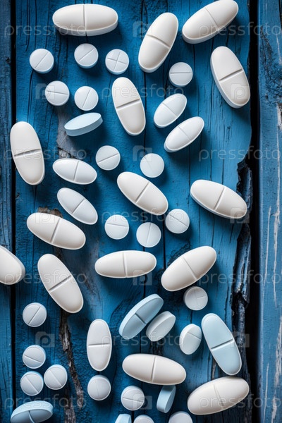 AI Generative Многие разные красочные медицинские витамины таблетки лекарства таблетки на синем фоне