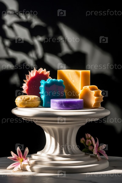 Барный кусок натуральное органическое ароматическое косметическое искусственное мыло ручной работы на стенде на черном фоне AI Generative