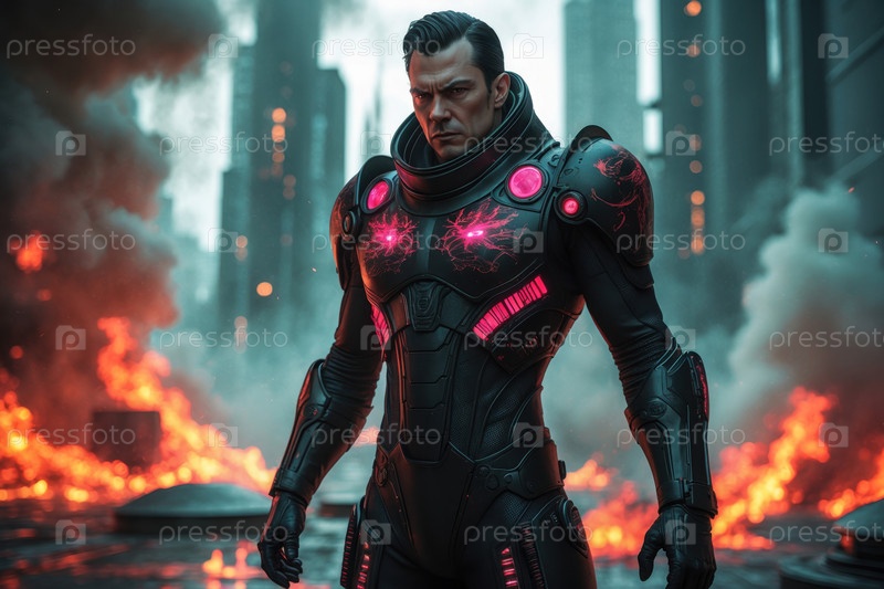 AI Generative Man гуманоид в футуристическом космическом костюме, человек на будущем научно-фантастическом завтрашнем фоне