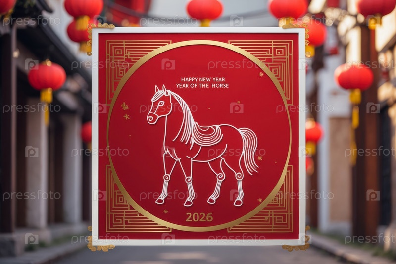 ИИ генеративная китайская праздничная новогодняя открытка поздравления с красной огненной лошадью 2026 Символы