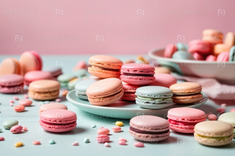 Французская кухня кондитерские изделия макаронные печенье на столе, натюрморт вкусных цветовых булочек AI Generative