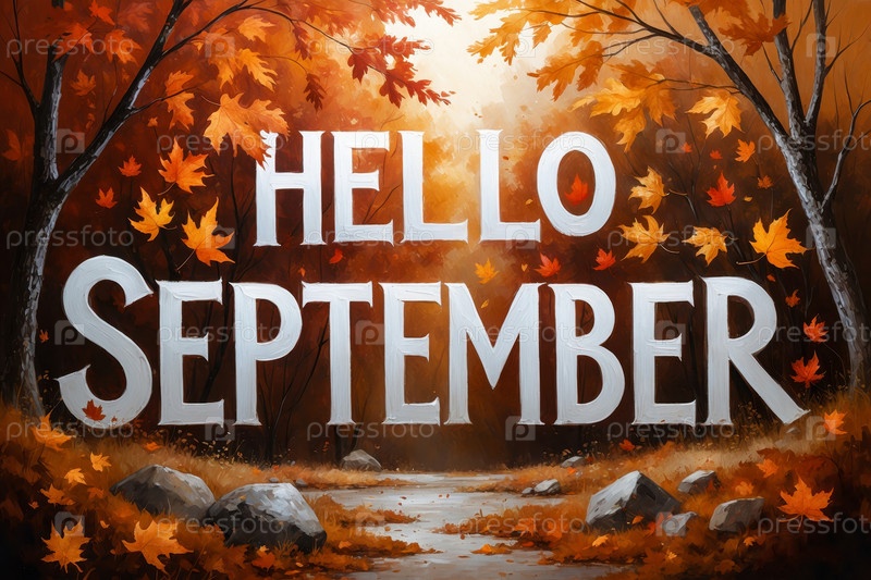Карточная надпись Привет сентябрь осень-осень фон желтый красный листья лист осенний AI Generative
