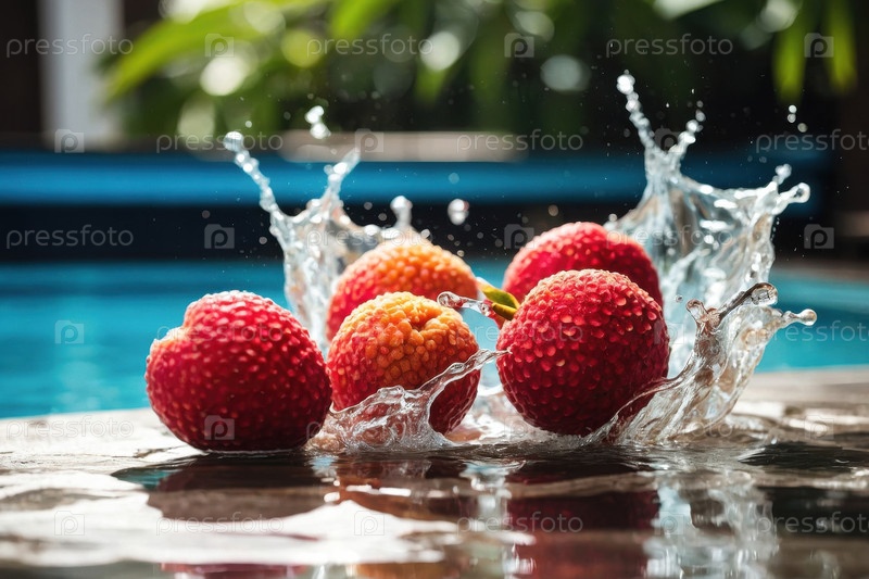 Экзотические фруктовые личики в распылении воды летом бассейн праздничный фон AI Generative