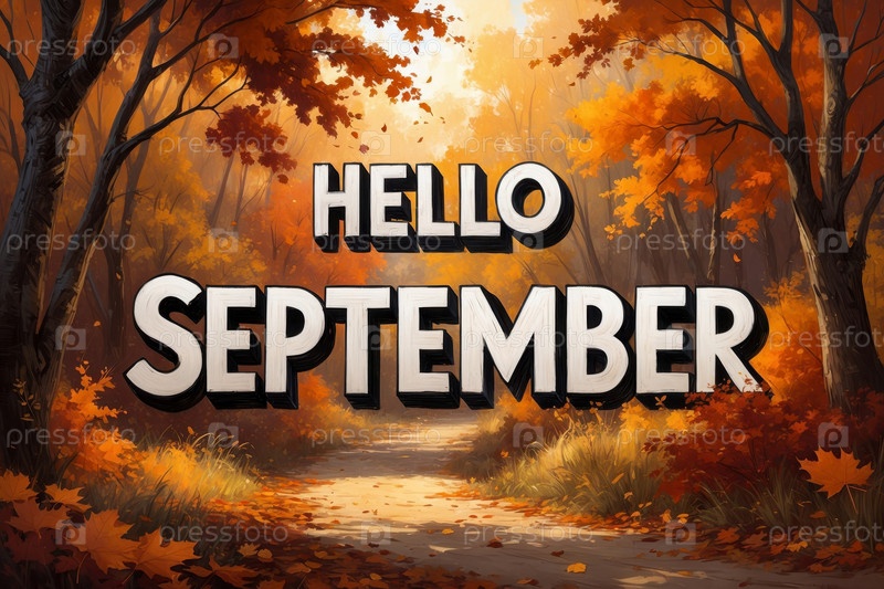 Карточная надпись Привет сентябрь осень-осень фон желтый красный листья лист осенний AI Generative
