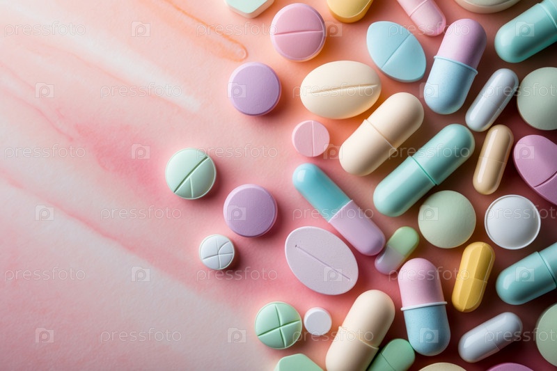 AI Generative Много разных красочных медицинских витаминов таблеток лекарств таблетки на розовом фоне