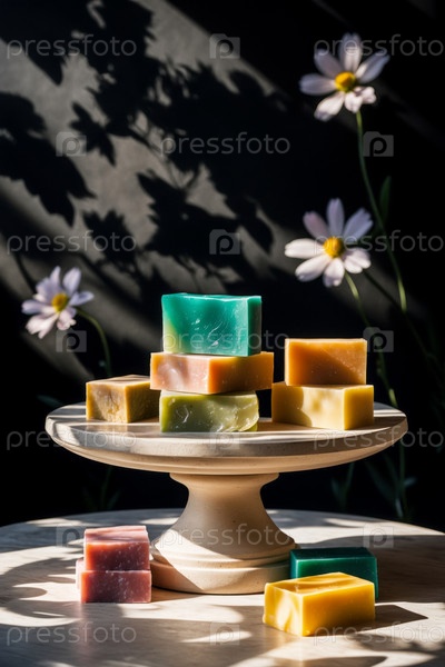 AI Generative Bar piece natural organic aromatic cosmetic handmade soap на стенде на черном фоне