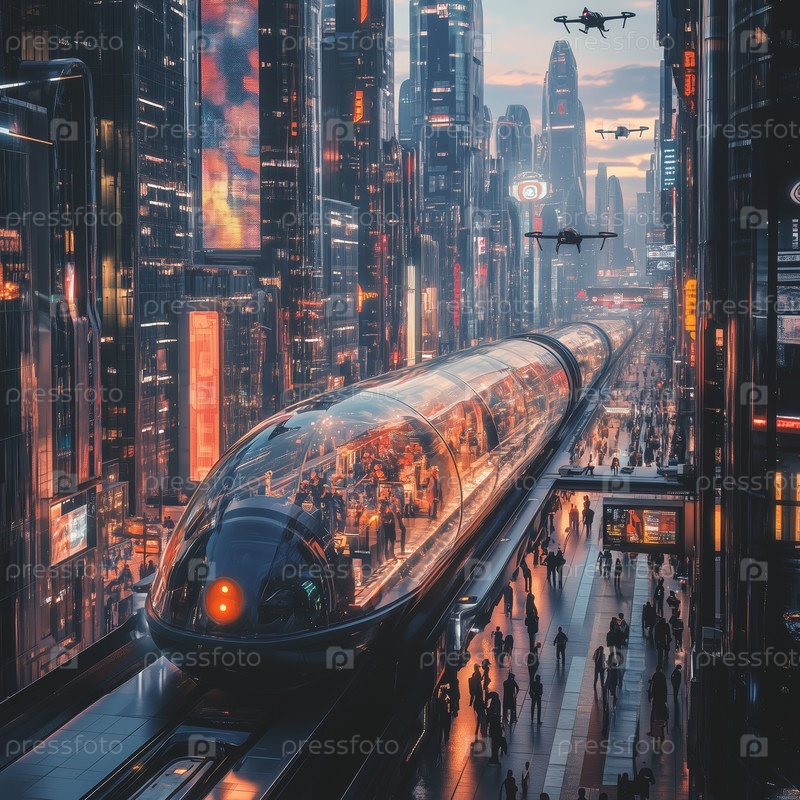 Футуристический город с сияющими высокоскоростными поездами и оживленной толпой