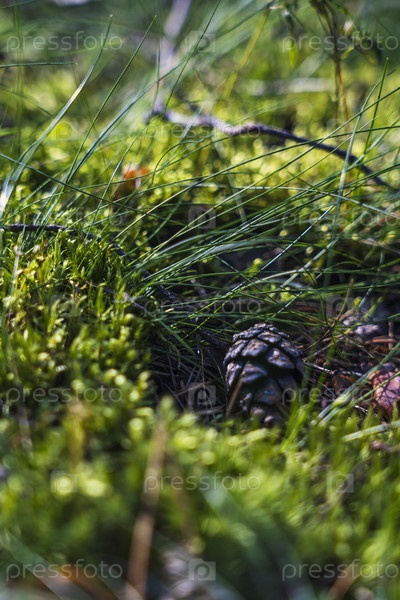 Сосновый конус на лесном полу, окруженный зеленым мхом и травой