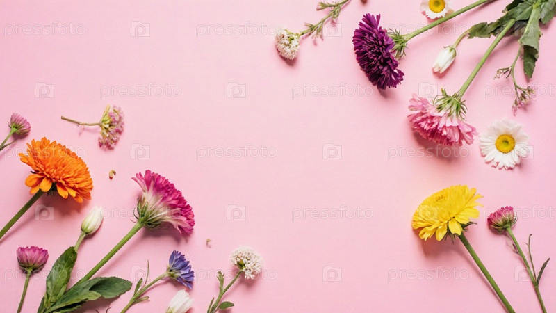 Яркие цветы астера, герберы и хризантемы вспыхивают цветами на мягкой розовой поверхности, создавая радостную атмосферу, идеально подходящую для веселого собрания сегодня днем