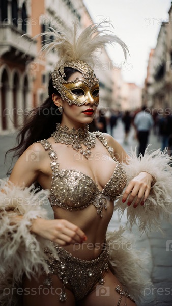 Одетая в блестящие наряды, женщина танцует по оживленным улицам Венеции, воплощая дух карнавала с изысканным стилем и грацией