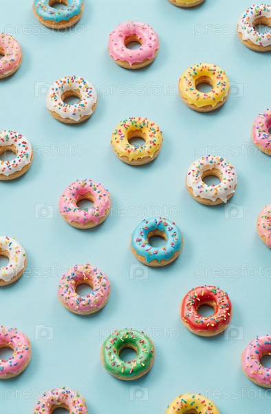 Живые пончики различных цветов и начинки разбросаны по мягкому синему фону, создавая радостную и восхитительную сцену, которая соблазняет все чувства Generative AI