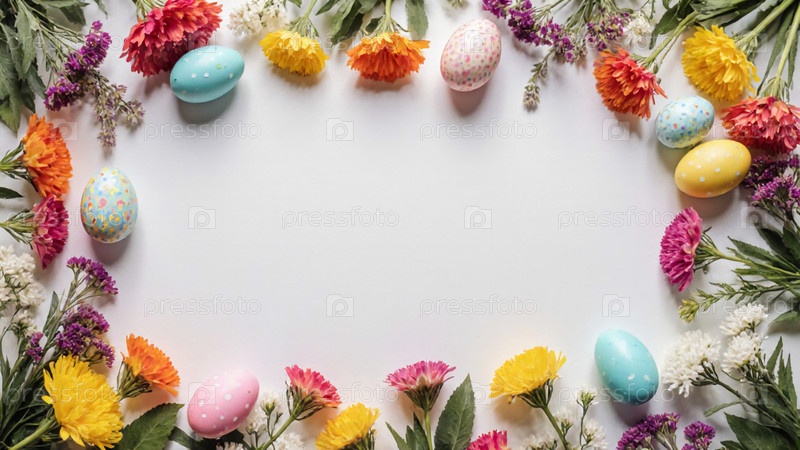 Вибрирующие цветы в различных оттенках окружают игривые пасхальные яйца, создавая веселую сцену для весенних праздников