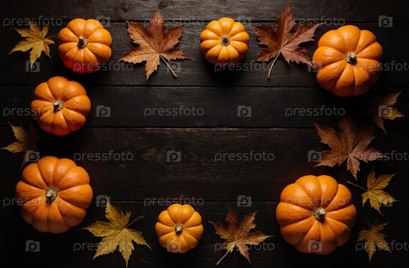 Ярко-оранжевые тыквы продуманно расположены на деревянном столе, окруженные красочными осенними листьями, вызывая чувство радости от урожая и сезонной красоты Generative AI