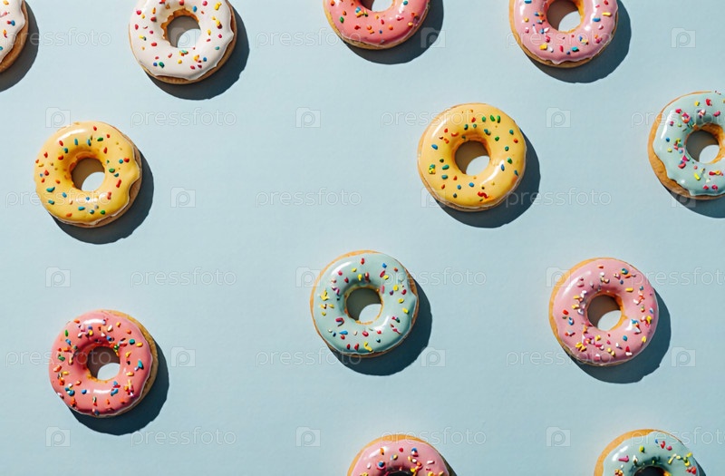 Разнообразные пончики в ярких цветах с посыпаниями творчески расположены на мягкой пастельной поверхности, принося веселую и восхитительную атмосферу любому моменту сладкого влечения Генеративный ИИ