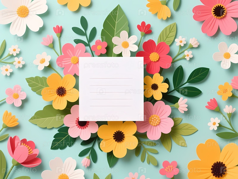 Очаровательная сцена показывает пустую карточку, окруженную массивом ярких ручной работы цветов в различных цветах и формах