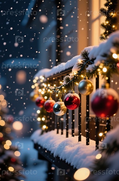 Красочные рождественские шары весело висят с заснеженного балкона.Мягкие огни мерцают при падении нежных снегов, создавая уютную атмосферу зимнего вечера Generative AI