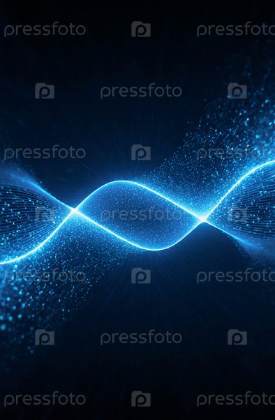 В темном, бесконечном пространстве блестящие голубые волны переплетаются между собой и мерцают крошечными частицами.Эта сцена демонстрирует красоту информационного потока и цифровой связи Generative AI