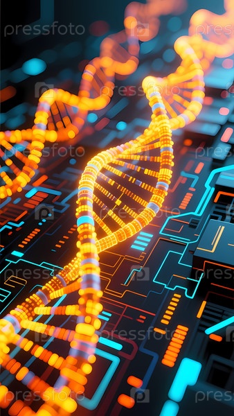 Ярко-оранжевая двойная спираль ДНК грациозно изгибается над фоном светящихся схем, демонстрируя синтез органического и цифрового миров в сумерках Генеративный ИИ