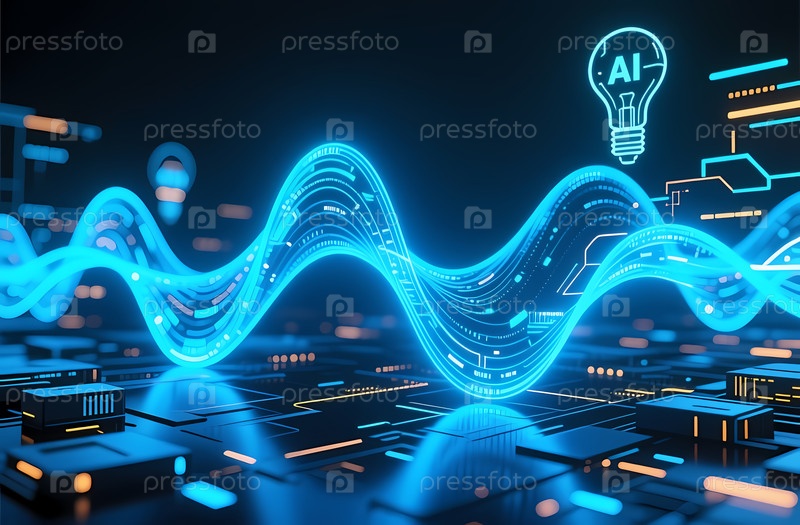 Вибрирующие синие и оранжевые волны протекают через сияющий цифровой ландшафт, сливая технологии и креативность в захватывающем опыте Генеративный ИИ