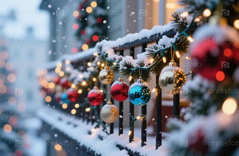 Очаровательный зимний балкон, украшенный блестящими рождественскими шарами и искривляющимися огнями, улавливает праздничный дух