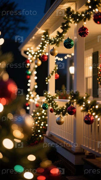 Ярко окрашенные рождественские шары висят с очаровательной террасы, красиво освещенной мерцающими огнями.Ночной воздух наполнен праздничным веселием и теплом Generative AI