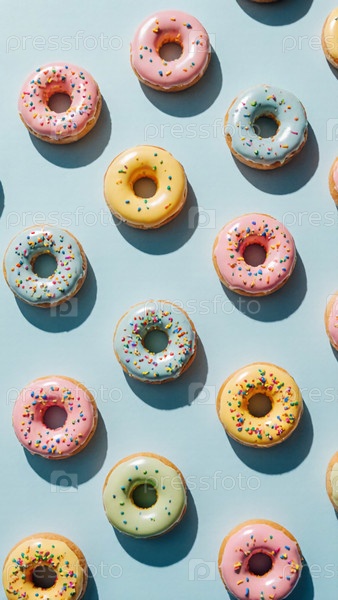 Ярко окрашенные пончики с посыпаниями тщательно расположены в игривом рисунке.Каждый пончик, отличающийся различными оттенками, приносит чувство причудливости и удовольствия Generative AI