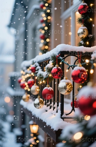 Красочные рождественские шары висят на заснеженной перилке балкона, в то время как нежные снежинки медленно падают с облачного неба, улучшая атмосферу зимней страны чудес