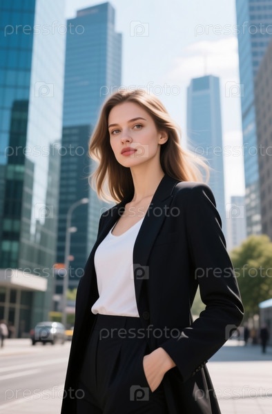 Стильная европейская американка стоит высоко в гладком черном костюме, излучая уверенность среди блестящих небоскребов под чистым голубым небом в самом сердце города Generative AI