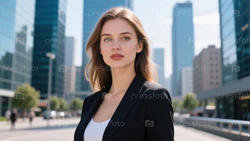 Красивая европейская американка излучает уверенность, когда стоит в городской обстановке.Окружают ее высокие небоскребы, демонстрирующие яркую атмосферу города под чистым голубым небом Generative AI