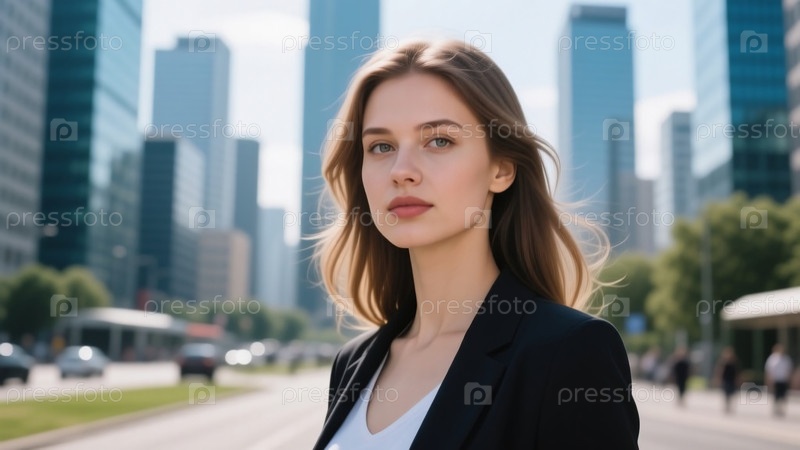 Уверенная в себе европейская американка стоит посреди оживленной городской обстановки, демонстрируя свою элегантность против высоких небоскребов под ярко-синим небом Generative AI