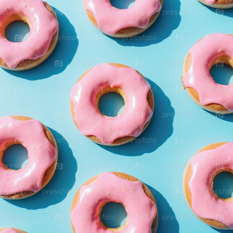 Красочные розовые пончики аккуратно сидят на ярко-синей поверхности, создавая веселую сцену, которая приглашает любителей десертов насладиться их сладостью Generative AI