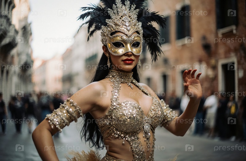 Живая сцена разворачивается, когда женщина в ослепительном золотом костюме демонстрирует свою элегантность на Венецианском карнавале