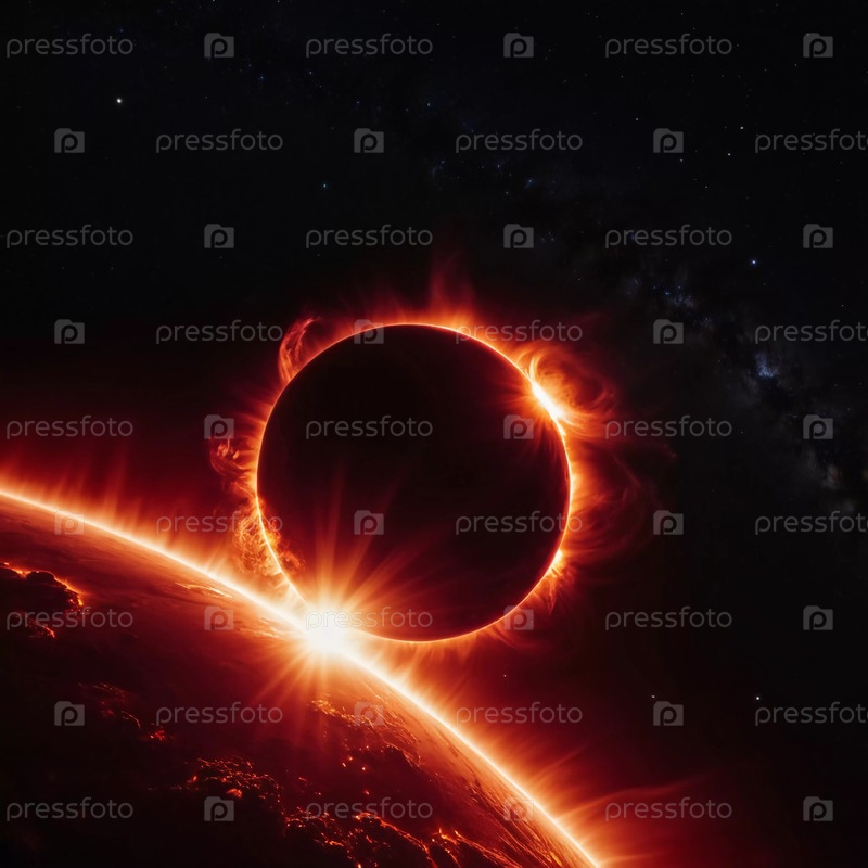 Потрясающее космическое событие разворачивается под светящейся выделением, с солнцем красиво затворенным сферой, освещающей окружающую тьму