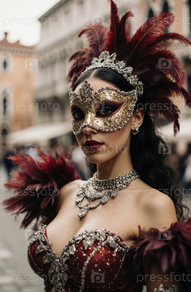 Женщина в потрясающем костюме стоит на оживленных улицах Венеции во время карнавала, празднуя радость и волшебство этого яркого культурного фестиваля