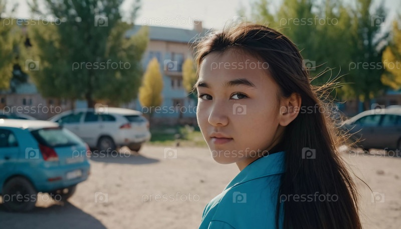На улице стоит молодая девушка с длинными темными волосами и серьезным выражением лица. Жительница Казахстана, красивая 15-летняя девочка. Ученица, студент или абитуриентка. Современное поколение. ИИ генерируется
