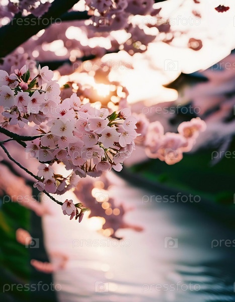 Нежные розовые вишневые цветки красиво цветут на ветке дерева во время весеннего сезона, заполняя сцену яркими цветами и ощущением обновления в природе