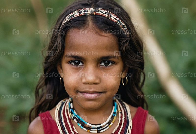 Молодая аборигенская девушка уверенно стоит, украшенная красочными ювелирными изделиями и традиционным костюмом, излучая культурную гордость среди пышной зелени и естественной красоты в дневное время Generative AI